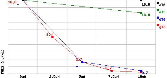 gT3 (gamma-Tocotrienol) und dT0 (delta-Tocopherol):deutlicher und schneller Abfall schon bei geringer Konzentration (2.5uM) auf fast Null bei 10uM
